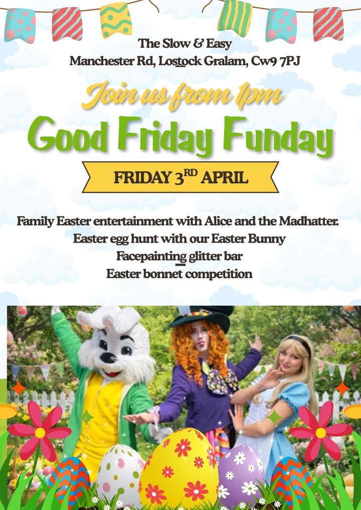 🐣 Family friendly fun this Easter Good Friday! Join us from 1pm when Alice and the Mad hatter will be entertaining you all with lots of fun and games