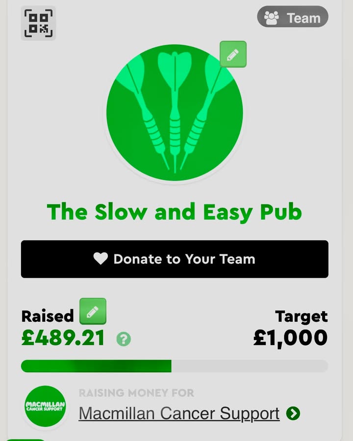 🎯 if you wish to donate please click on the below link or simply drop any change or notes into the bucket next to the darts board. https://dartsmarathon.macmillan.org.uk/teams/the-slow-and-easy-pub