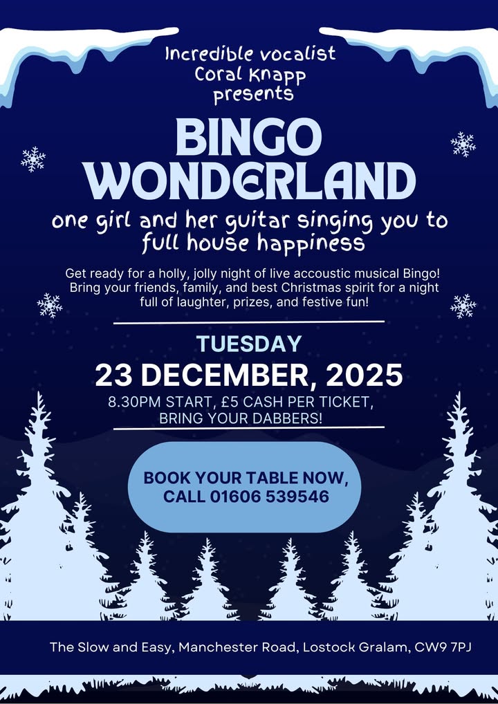To book a table please call 01606 539546 or visit www.opentable.co.uk and add a note for Bingo Wonderland!
