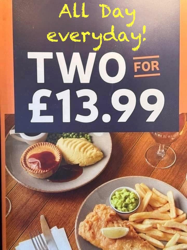 🥩 Why not join us for food and have 2 main meals for £13.99 all day everyday.